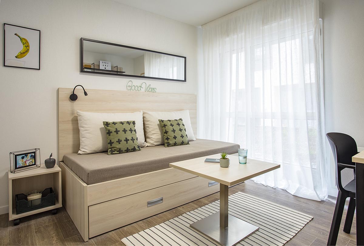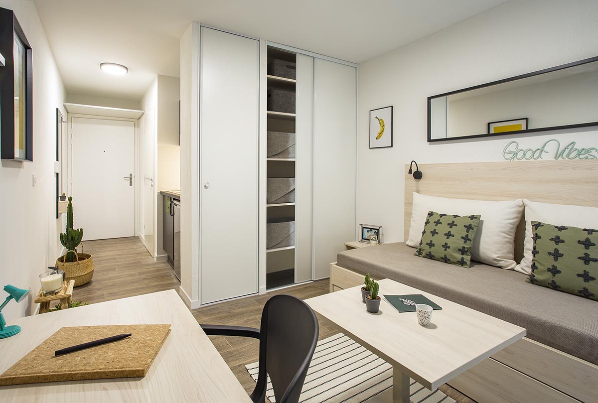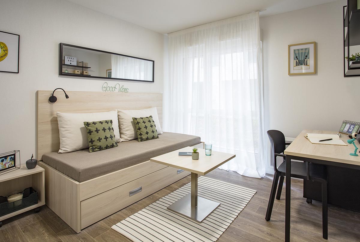 Campus Lena met à disposition 100 logements T1 entièrement meublés et équipés, répartis sur 4 étages. Chaque studio comporte 4 espaces pensés pour optimiser la circulation et la lumière à l’intérieur. L’ensemble des équipements et du mobilier de la résidence a fait l’objet d’un choix attentif avec comme maîtres-mots design, confort et pérennité. Côté espaces communs et services à disposition au sein de la résidence, les étudiants bénéficient de la présence d’un responsable de résidence dédié, en charge de la distribution du courrier, mais aussi d’une laverie équipée, d’une salle de sport et d’un local vélo sécurisé.